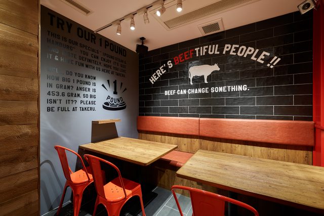 GRAPHIC 1ポンドのステーキハンバーグ タケル 店内グラフィック https://steak-takeru.jp/?mode=f2 DETAIL 空間デザインを担当するエリアコネクション様にお声がけいただき、店内のグラフィックを担当させていただきました。